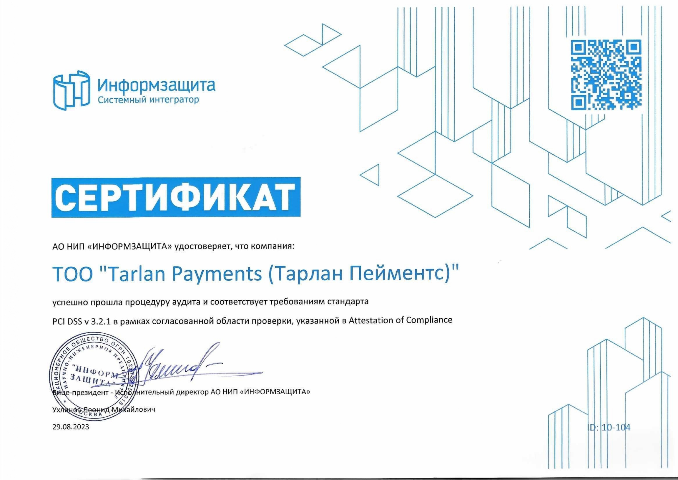 Tarlan Payments жыл сайын осы сертификаттаудан өтеді және PCI DSS-тің барлық талаптарына сәйкес келеді
