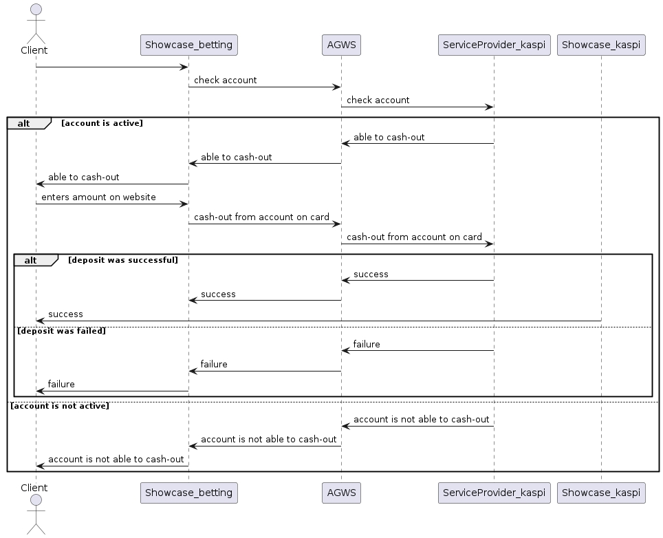 In case your system acts as a showcase: The client initiates a withdrawal request from your system (for example, to the client's card), the request goes to /check in AGWS, after which AGWS goes to the bank to receive user verification. Upon successful verification, your system initiates a request for /cash-in to the AGWS system, after which AGWS makes a request for replenishment of the amount received and gives the transaction status to your system