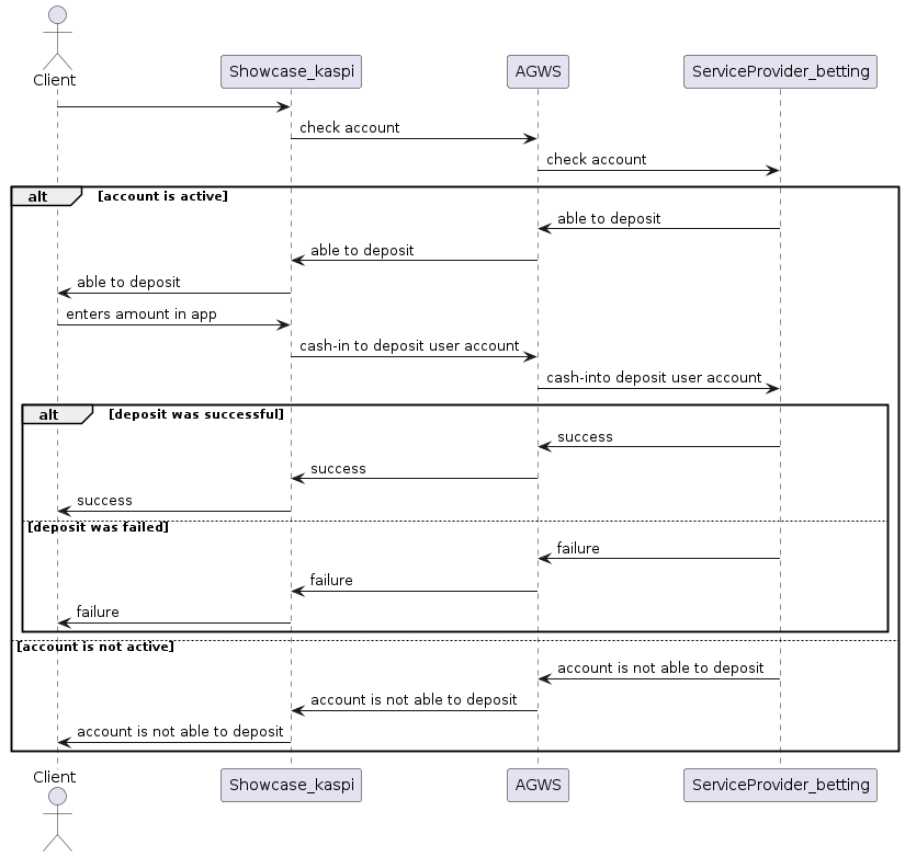 In the case when your system acts as a service provider: The client logs into the application (website) and initiates verification of his account, the showcase (for example, Kaspi App) sends a request to AGWS for account verification (/check), AGWS sends a request to your system for account verification. If the user's account is available for replenishment, a successful response is returned to the user, after which he is given the opportunity to deposit. The user enters the required amount and clicks the deposit/pay/make a payment button, the showcase sends a request to AGWS (/cash-in), after which AGWS sends a request for deposit amount in your system for this account.
